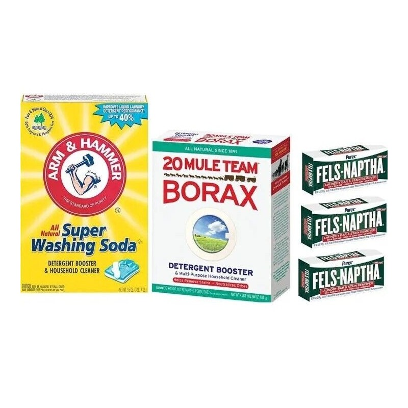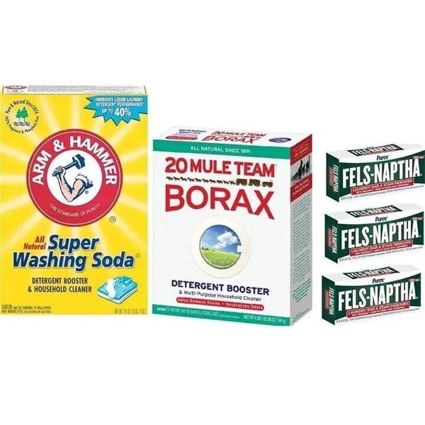 Kit includes 20 Mule Team Natural Laundry Booster-Borax - 4lb box, Arm & Hammer Washing Soda - 55 oz and three 5.5 oz bars of Fels Naptha soap. Directions: Shred all 3 bars of soap with a grater and mix with the borax and washing soda. Seal in an air-tight container. (Optional to include - OxiClean - 1.5 lbs).