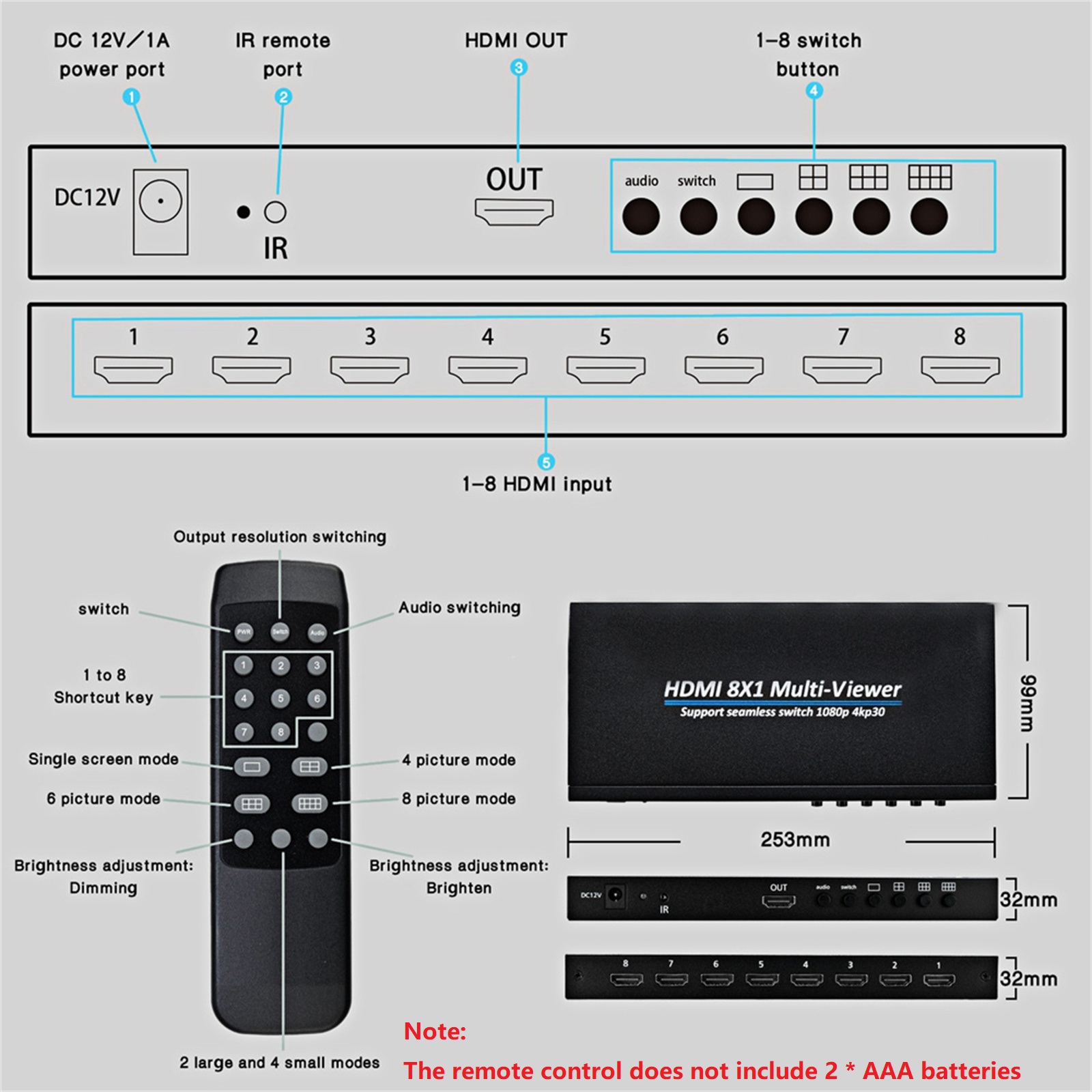 1080P 4K HDMI 8X1 Multi-Viewer 8 IN 1 Out Multi Screen Splitter HDMI Switcher