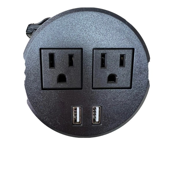 Desktop power grommet’s power output:120V/12A,USB ports:5V/2A, 6.5ft Standard Power Cord for the sockets.