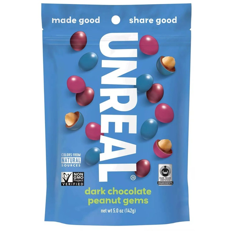Its name may be unreal, but there's nothing artificial about what goes into these delicious dark chocolate peanut gems. Bite into the crunch of peanuts wrapped in smooth dark chocolate that melts-in-your-mouth. Everything about these little bites is simply natural, just organic, vegan ingredients and Fair Trade 72% cacao. They're even naturally colored with vegetables. Made with Fair-Trade chocolate and organic, gluten- and soy-free ingredients. Includes one 6 oz. bag of Dark Chocolate Peanut Gems. See nutrition fact panel for allergens. Of course snacks should be fun, but what about changing the world? We think that that should be fun too. Finding just the right cabbages, beets and carrots for our colors, paying farmers fairly, sourcing non-GMO, sustainable ingredients: all happy days. The only thing we're more serious about than fun? The taste.
