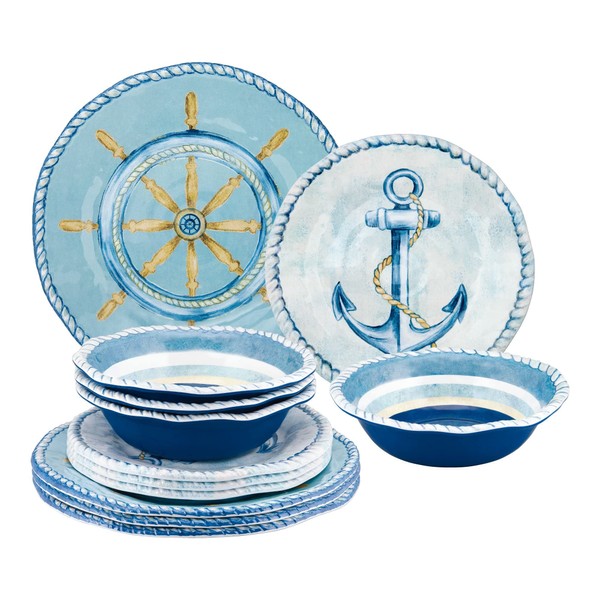 UPware 12-Piece Melamine Dinnerware Set, Includes Dinner Plates, Salad Plates, Bowls, Service for 4. (Sail Away)
