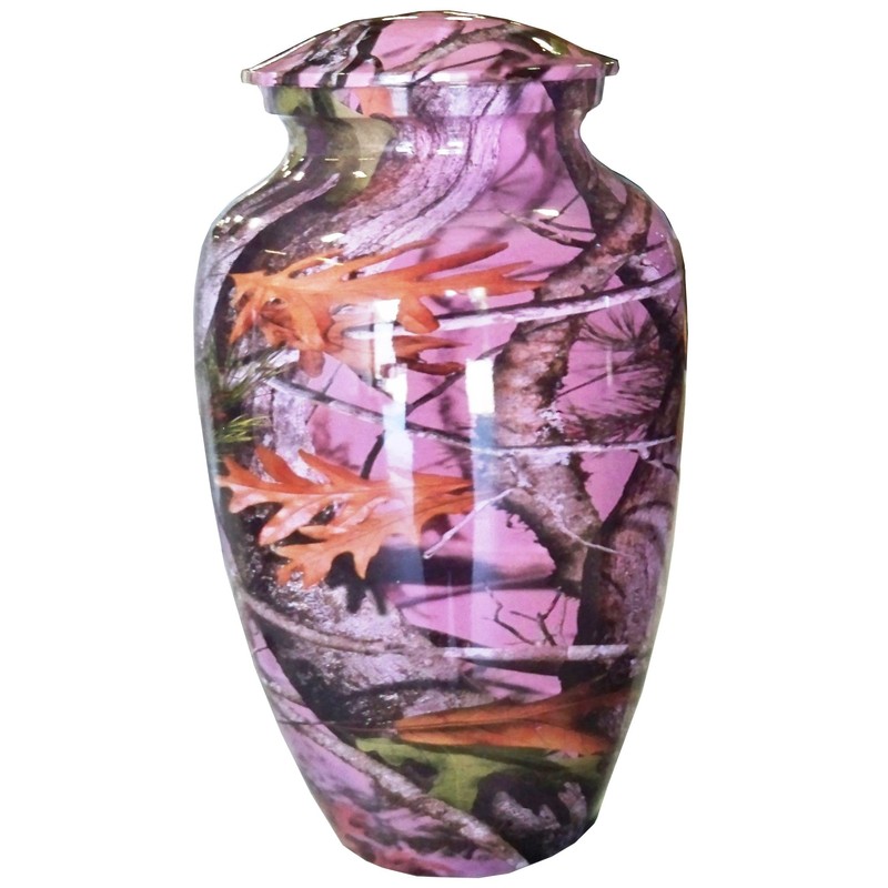 Adult sized Camo cremation urn over a dusty pink background. Imported from India and finished in the USA
