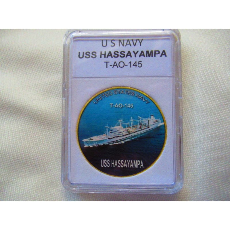 This is a great looking US NAVY - USS Hassayampa (T-AO-145) commemorative challenge coin. Coin has reeded edges and is about 1 9/16" in diameter. Front side of coin is printed and colorized while the rear side is raised lettering and gold plated. Coin is contained in an acrylic air tight holder.