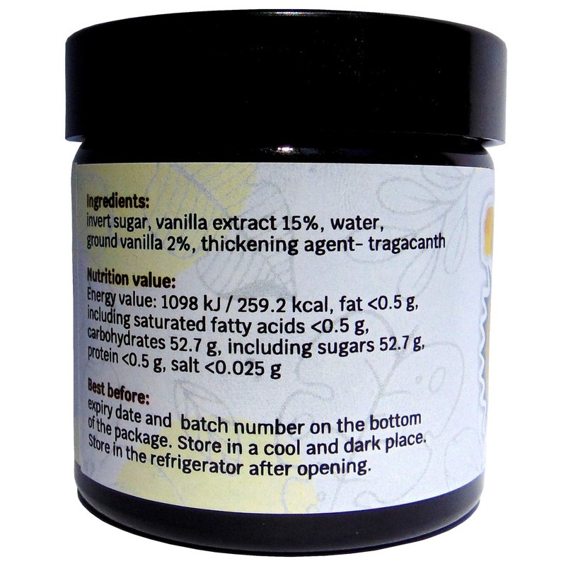 - Ingredients: invert sugar, vanilla bean extract 15%, water, ground vanilla 2%, natural thickening agent-tragacanth