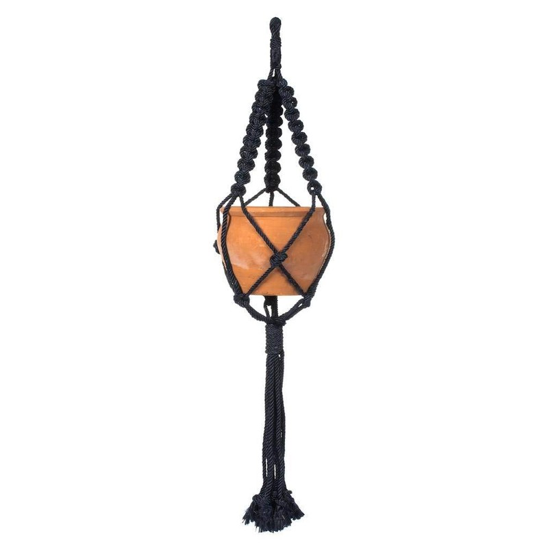 This Terracotta pot stands 4. 5 inches tall with a width of 5. 75 inches. The pot is cradled in a black rope that ensures secure hanging. It comes ready for any type of greenery to be added, if desired.