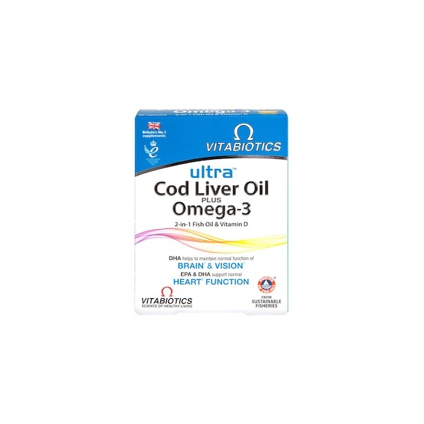 Vitabiotics Ultra Cod Liver Oil Capsules contain a super strength marine oil formula that conveniently provides the benefits of both omega-3 fish oil and cod liver oil in a 50:50 ratio. The high-grade oils used provide rich sources of the essential fatty acids, DHA (Docosahexaenoic acid) which contributes to the maintenance of normal vision & brain function, together with EPA (Eicosapentaenoic acid) which contributes to normal heart function.