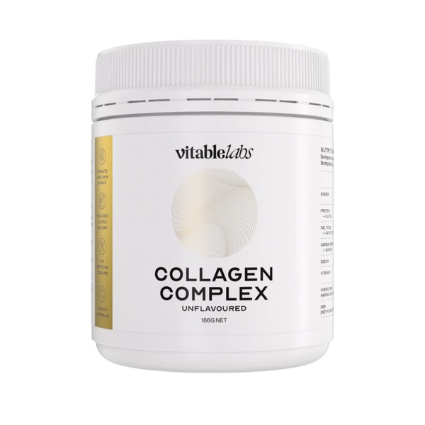 The VitableLabs Collagen Complex 186g - 30 serves is a premium supplement designed to support skin, hair, and nail health. This advanced collagen formula combines high-quality ingredients to promote overall wellness and vitality. With 30 servings per container, it provides a convenient and effective way to incorporate collagen into your daily routine. The VitableLabs Collagen Complex is crafted to enhance the body's natural collagen production, helping to maintain youthful skin, and strong hair and nails. What are the features and benefits of VitableLabs Collagen Complex 186g - 30 serves? Supports natural collagen formation and skin elasticity. Promotes healthy hair and nail growth. Promotes skin hydration and glow. Convenient 30-serving size for a month-long supply. Who is VitableLabs Collagen Complex 186g - 30 serves for? Ideal for individuals seeking to improve their skin, hair, and nail health through a natural supplement.