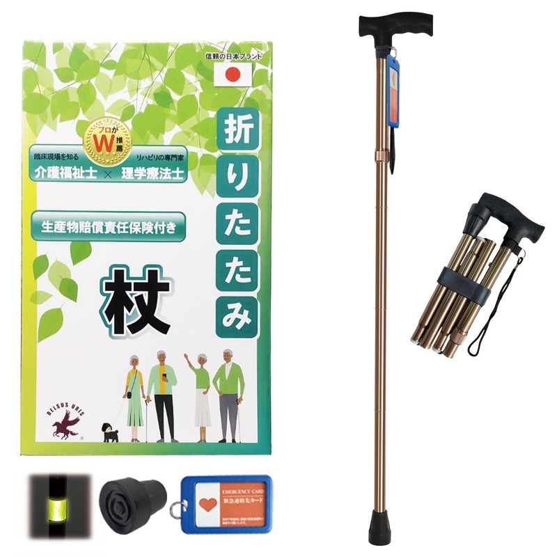 杖 折りたたみ 男性用 女性用 【理学療法士&介護福祉士 W推薦】お洒落な色 便利付属品3点付き 軽量 持ち運び 敬老の日 コンパクト 替えゴム 反射シール 緊急連絡先カードBELSUS URIS (シャンパンゴールド158‐180cm)