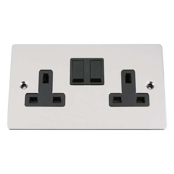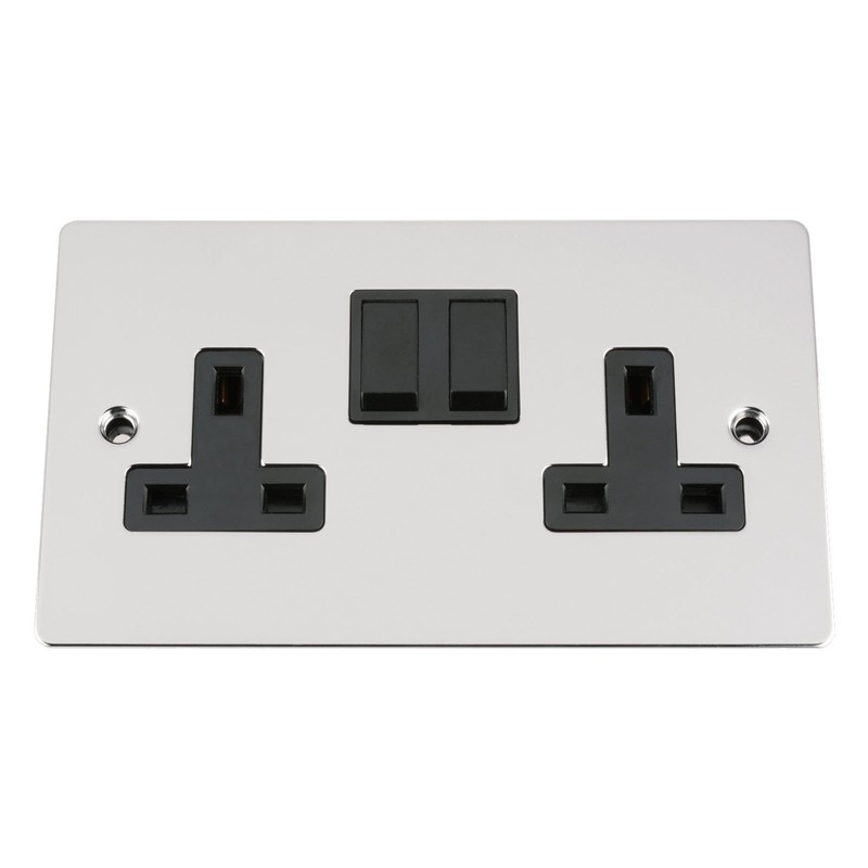 Wall Socket Double / 2 Gang - Polished Chrome Flat - Black Insert Plastic Switch - 13A Double Wall Plug Socket