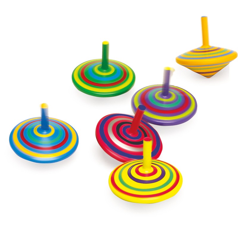 - Six colourful wooden spinning tops