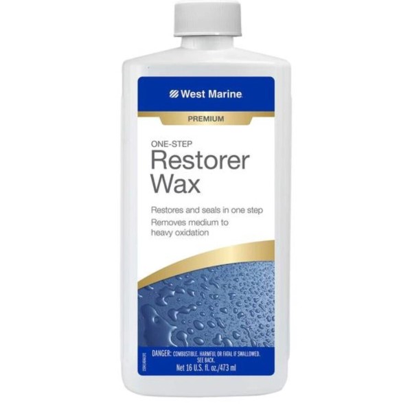 Removing oxidation from the hull and deck used to mean once around the boat with a rubbing compound, followed by another lap with a protective wax. West Marine One-Step Restorer/Wax has combined these two steps to speed up the process. The copolymer formula features polishing agents that remove moderate oxidation. A UV resistant barrier is left behind that lasts through the hot days of summer. For best results we recommend cleaning the surfaces to be detailed with West Marine Boat Soap prior to application of Restorer/Wax. Get back on the water faster by handling two jobs at the same time with our Restorer/ Wax.