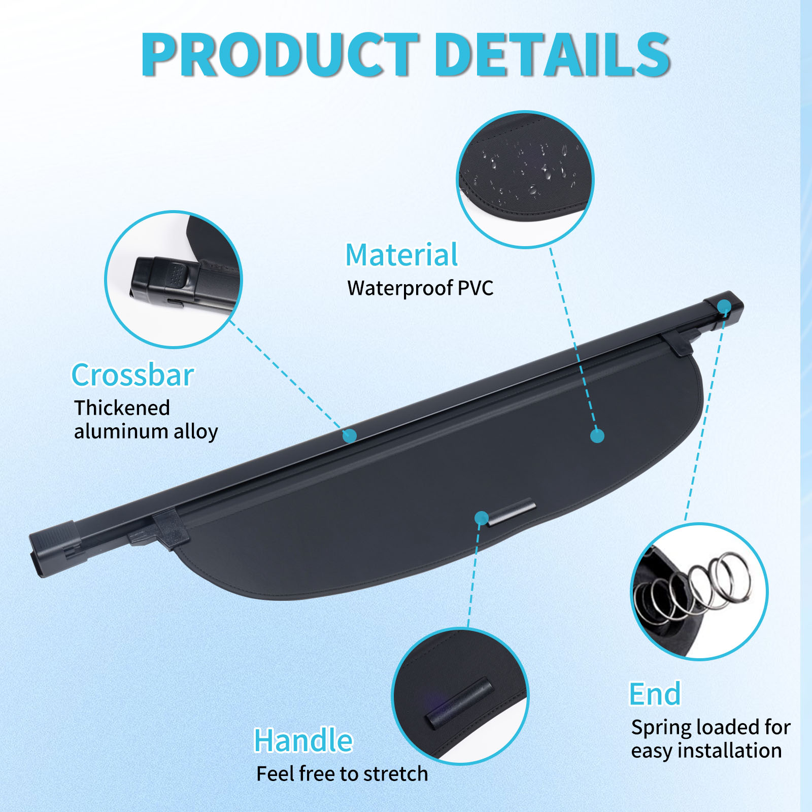 【High-Quality Materials】The retractable cargo cover is crafted from high-grade aluminium alloy & waterproof PVC with canvas texture, structural reinforcement form. this rear cargo cover is also tear-resistant, lightweight, water-repelling, easy to clean, adjustable and durable.