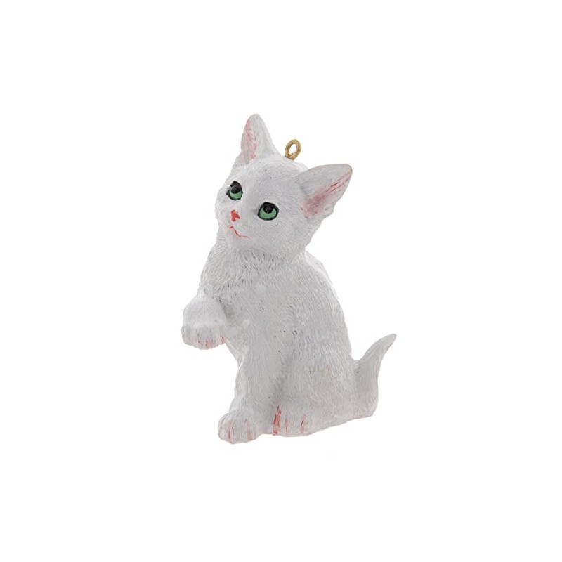 - Product Description: Decorate the purr-fect tree this holiday season with this White Kitten Ornament! This classic resin ornament depicts a young cat with a white color, textured fur details, pink color on the paws, ears, and nose, and big green eyes looking upwards. The kitten is sitting and striking a cute pose with a tilted head and a single paw raised. Take its included metallic gold thread and hang it up from your Christmas tree for festive decor cat lovers will adore!