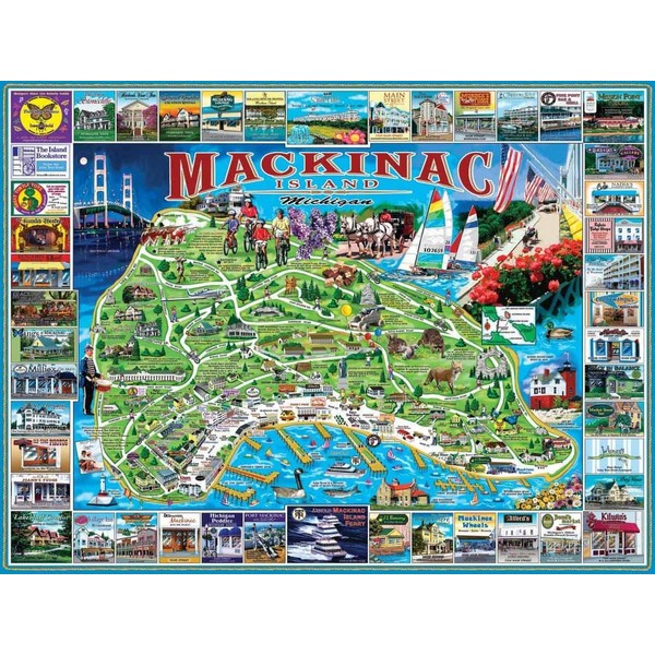 • MACKINAC ISLAND, MICHIGAN: This colorful and informative jigsaw puzzle pays tribute to Mackinac Island, Michigan. Enjoy the beautifully illustrated images in this updated view by artist Gary Torrisi.