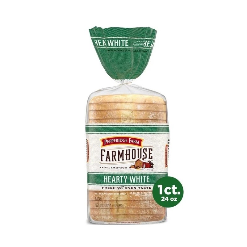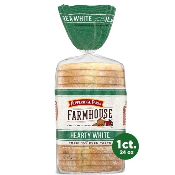 The Pepperidge Farm Farmhouse Hearty White Bread is a 24 oz loaf of high-quality bread made by the trusted brand, Pepperidge Farm. This bread is perfect for making sandwiches, toast, or simply enjoying as a side for meals. With its hearty white color and delicious taste, it is sure to be a staple in any household's kitchen.