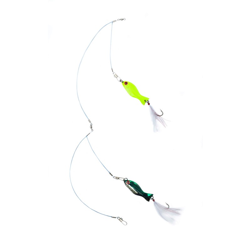- Overall length of 23", 1/2 oz. lure on the high connection and 3/4 oz lure on the low connection of the rig