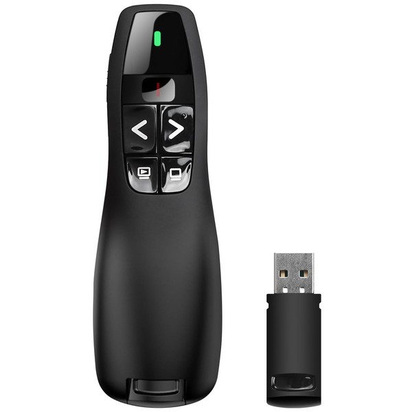 - Intimate design: compact size and ergonomic design allow you to hold the presentation hands comfortably in your hand and fit easily in your bag for easy transportation. The USB receiver is stored in the PowerPoint remote control presenter, so you don't have to worry about losing it.