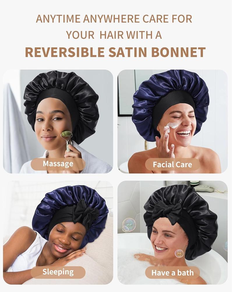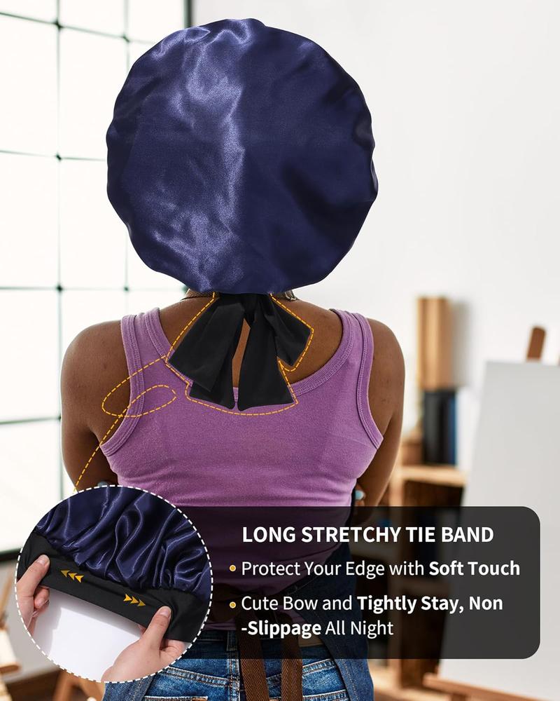 Women Hair Silk Bonnet with Elastic Tie Wide Band Adjustable Bonnet for Curly Hair - Sleepy Shower Cap, Facial Care, Makeup - Color: Navy