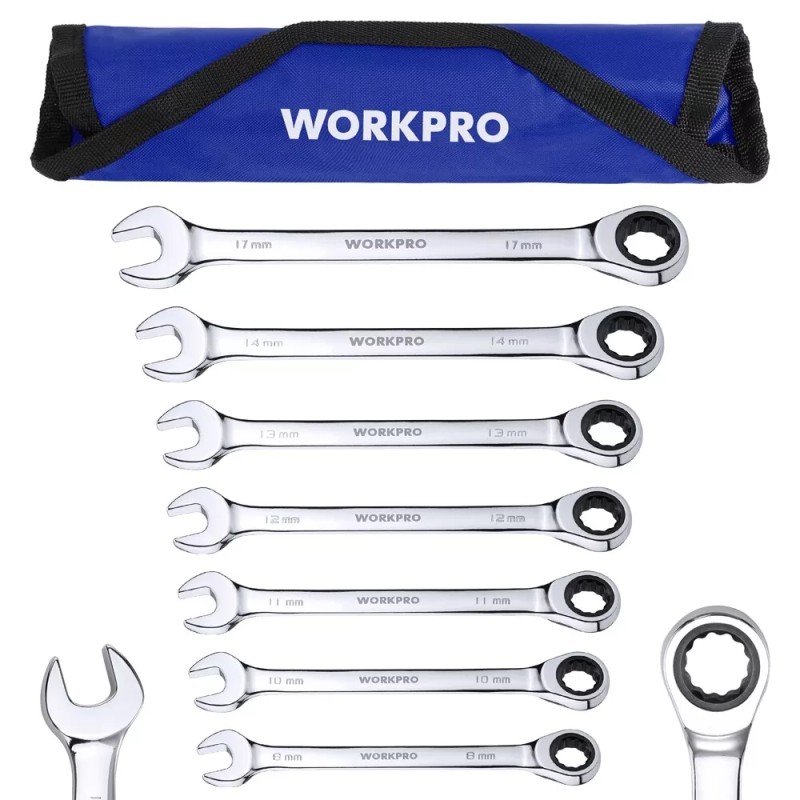 Workpro 8mm-17mm Ratcheting Combination Wrench Set 7PC Combo Wrench Metric Roll Up Pouch
