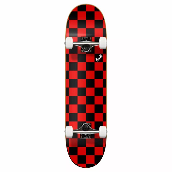 Complete Checkered Skateboard This new school skateboard comes with a mellow concave allowing for a more flat-footed skating style. The edges of the board are not so bowled compared to medium and steep concaves. This great checker pattern can be found in multiple color variations including blue, red, green, purple, white, pink, yellow, orange, and silver checkers