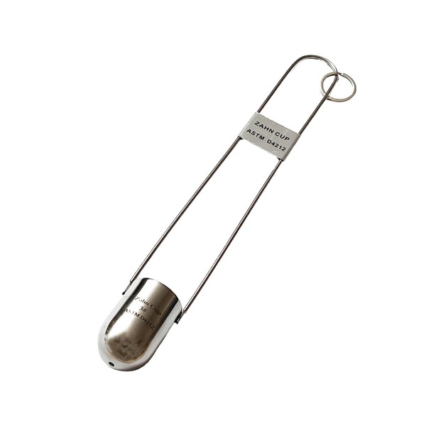 A Zahn cup is a viscosity measurement device widely used in the paint industry. It is commonly a stainless steel cup with a tiny hole drilled in the centre of the bottom of the cup. There is also a long handle attached to the sides. There are five cup specifications, labelled Zahn cup #x, where x is the number from one through five (see table below). Large number cup sizes are used when viscosity is high, while low number cup sizes are used when viscosity is low. They are manufactured in accordance to ASTM D 4212, ASTM D1084 and ASTM D816