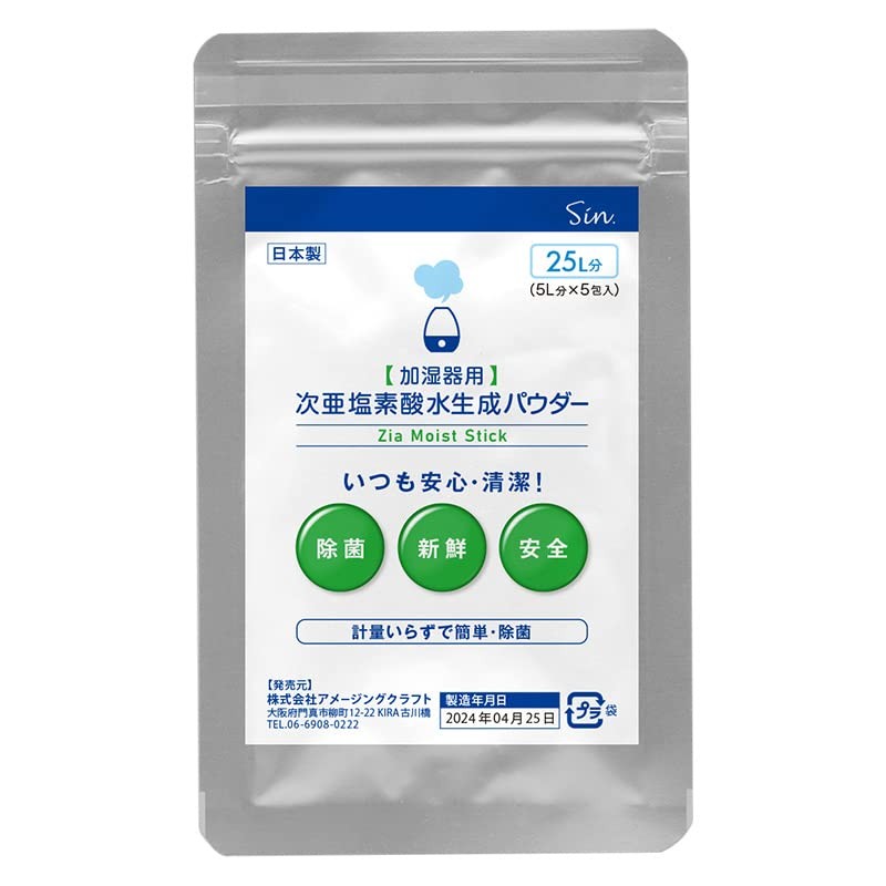 加湿器用 計量要らずの 次亜塩素酸水生成スティック Zia Moist Stick 5L分 x 5包 (25L分) パウダー 効果測定試験済 簡単に最適濃度の次亜塩素酸水が作れる